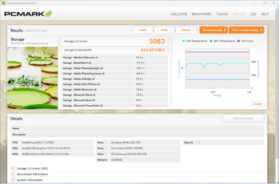 在PCMark 8测试中,朗科NV7000-t 1TB PCIe4.0 SSD的得分为5083分,平均传输速度656.60MB/s,这个成绩十分不错,甚至比一些有缓的方案PCIe 4.0 SSD还要强。