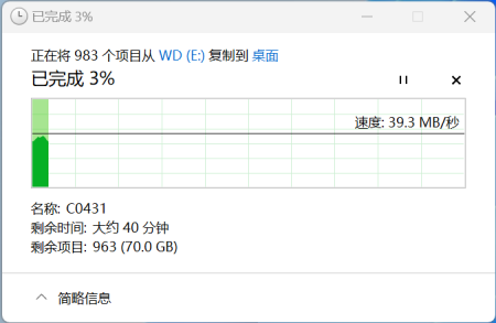这是什么概念呢?我用机械式移动硬盘读写这个文件时,写入速度大约只有40MB/s,完成需要40分钟。对比朗科NV7000-t 1TB PCIe4.0 SSD超快读写速度,简直一个天上一个地下。