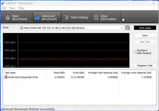 使用TxBENCH软件,在无分区的情况下,进行的全盘连续写入测试,测试期间会填充整个盘的可用空间。