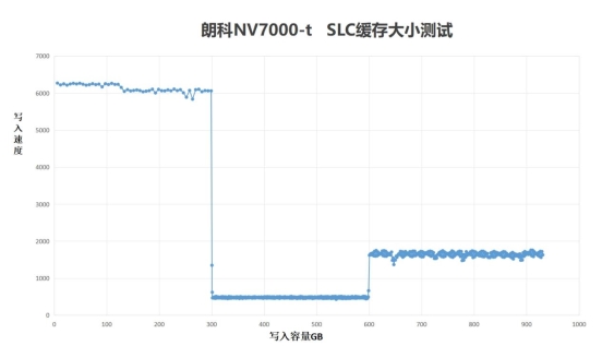更换主控方案后,朗科NV7000-t 1TB给到SLC Cache容量达到300GB左右。相比之前120GB空间,显然这个SLC缓存策略可以更好应付高强度的重负载写入。在有SLC 缓存时,写入速度在6000MB/s以上; 用完后掉到500MB/s左右; 最后那段则是空白闪存用光了,在一边擦除一边写入,写入速度又能提到1700MB/s。