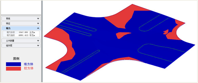 (3)进行精确的土方量计算,实现土方可视化校核。交叉口土方工程量往往是财审过程中较容易被审查的内容,经常因计算不准确发生争议。传统道路土方计算主要采用平均断面法,但交叉口因断面形状不规则,在进行土方计算时难以精确确定各断面的面积,计算结果误差大。本文采用方格网法,分块计算交叉口土方,并可生成填挖方体,实现填挖方的可视化,提高土方工程量的可校核性,避免土方计算争议。
