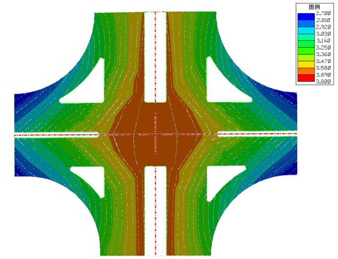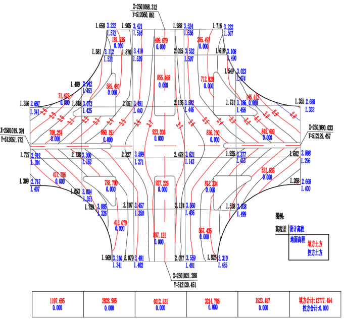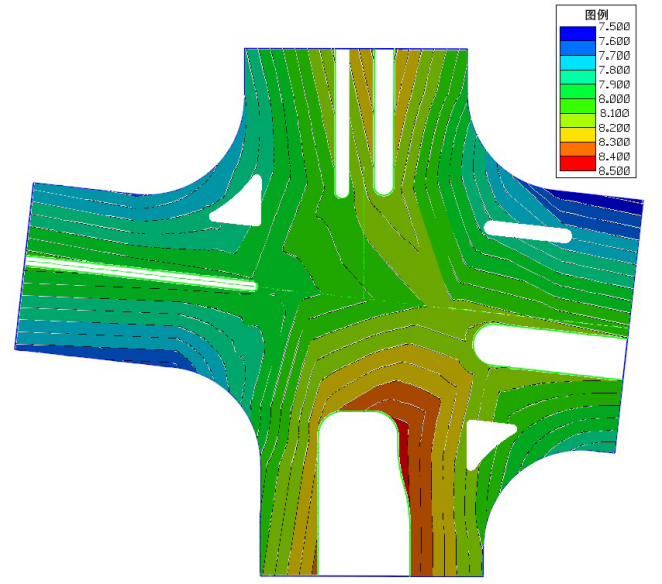 交叉口路面数字地面模型完成后,通过调整显示样式,显示交叉口等高线图。然后按(3.2)节步骤完成土方平衡设计。