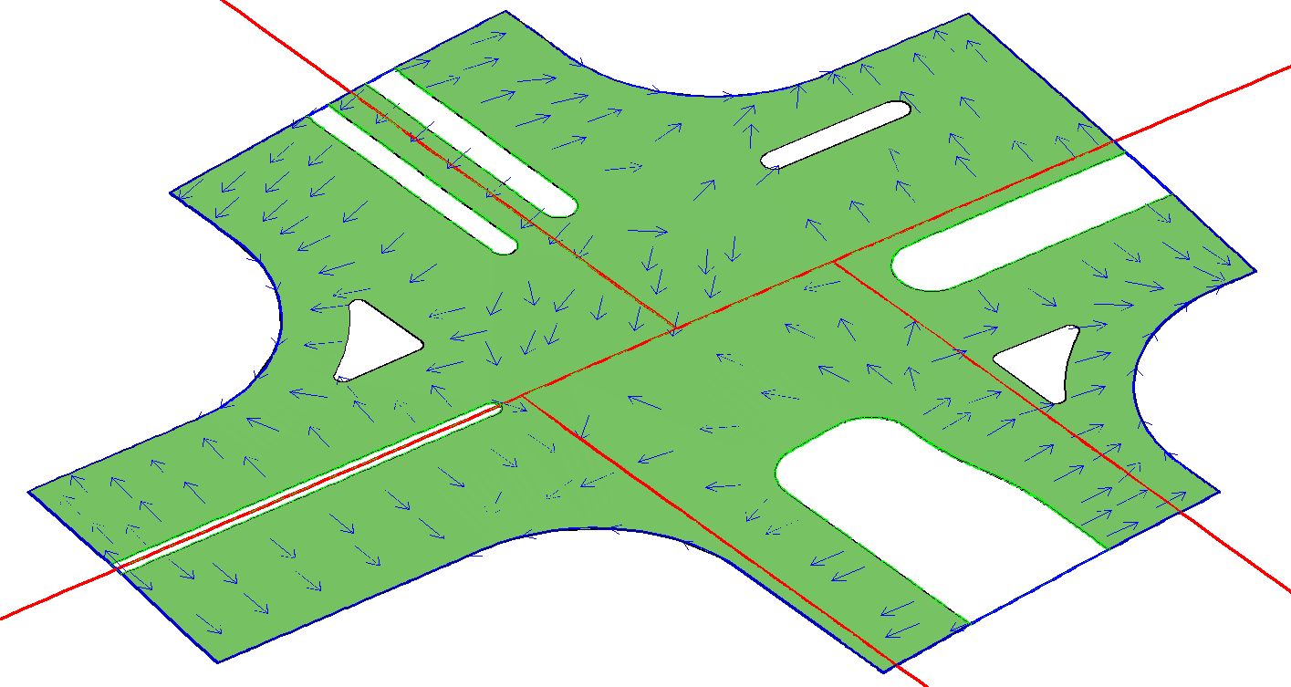 (2) 参照(1)步的方法将道路中线高程按横坡分别赋予渠化岛边线和绿化带边线。将三维绿化带边线和渠化岛边线以及三维路脊线作为特征线加到初始数字地面模型中修正,得到特征线修正后的交叉口数字地面模型。