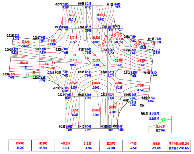 按(3.2)节步骤完成土方平衡设计,将土方平衡图叠加在等高线图上完成交叉口竖向设计和土方计算。