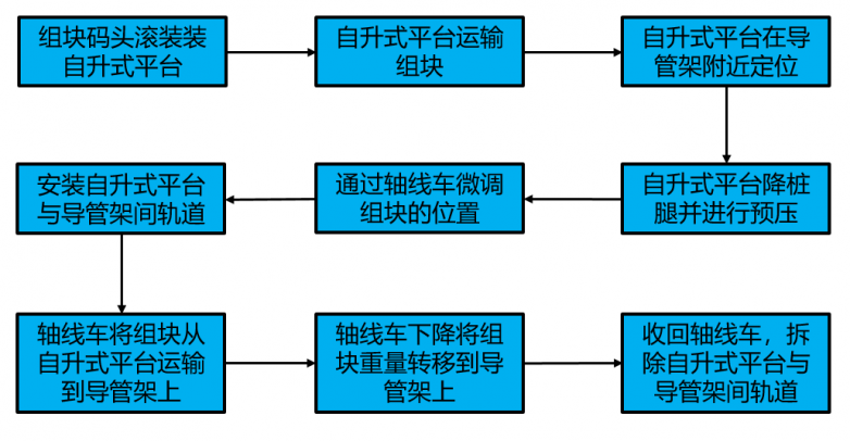 码头滚装装船是为了解决吊装船无法实现码头装船而产生的一种装船方式。一般情况下,海上结构物是采用吊装装船模式,但是此方法对于吊装设备的要求较高,当结构物重量较大时,在没有大型起重设备的情况下,吊装作业往往无法实施[3]。大型浮吊船不但数量稀少,费用高昂,且受码头水深和船舶吃水的限制,可能无法靠近码头,使得装船过程变得极为复杂,甚至可能延误工期,造成经济损失。为充分利用现有的设备和技术力量解决大型结构物装船问题,结构物滚装装船法应运而生。滚装装船是利用轴线车(Self-propelled Modular Transporter, SPMT)将被运输物从码头直接运输到船舶上,由于轴线车配车方案灵活,无需预先设置滑道,且可通过调整车的数量来降低对地承载力,因此其对码头承载力要求低,可适用更多的码头条件[4]。本文提出的利用自升式平台滚装安装升压站组块方案是利用自升式平台可升降的特点,将码头滚装装船技术应用到组块海上安装中,该方案的施工流程见图1。
