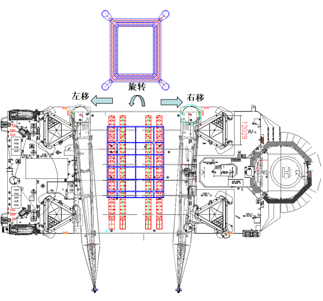 组块在通过轨道梁滚装前,需对组块在自升式平台上的位置进行调整,以保证组块通过轨道梁滚装后可顺利与导管架腿对位连接。组块海绑在自升式平台上后,两侧需预留一定的空间,滚装前,组块的位置调整通过移动轴线车来实现向左右移动或旋转,位置调整按照组块位置偏差小于轨道梁允许偏差的原则来控制。组块位置调整思路见图13。