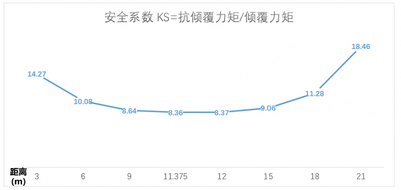 自升式平台的抗倾覆能力为平台安装后的水中自重乘以平台重心距滚装安装方向桩腿重心的距离,以表1中自升式平台为例,该平台的水中自重为15248.1吨,平台重心距滚装安装方向桩腿重心的距离为17.1m,则平台的抗倾覆力矩为2558271.1吨米,根据以上计算可得到组块滚装至不同位置时自升式平台抗倾覆安全系数情况,具体计算结果详见图10。从计算结果可知组块移动到导管架与自升式平台中间位置时抗倾覆安全系数最低,此状态是抗倾覆的控制工况,需重点关注。