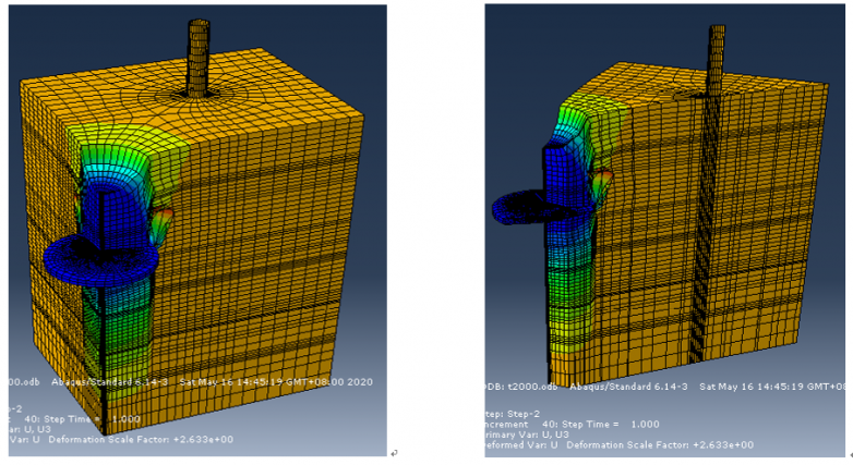 自升式平台的基础一般为桩靴,平台安装后桩靴会深入泥面以下一定深度,由于安装过程中自升式平台距升压站导管架距离较近,因此需核算自升式平台压桩和拔桩过程中桩靴的影响范围,以导管架的钢桩在桩靴影响范围以外为标准,确定自升式平台与升压站导管架的间距[5]。桩靴影响范围可采用有限元进行桩靴及土层建模,通过桩土分析得到桩靴影响范围,图9为以某自升式平台为例计算桩靴影响深度的结果。