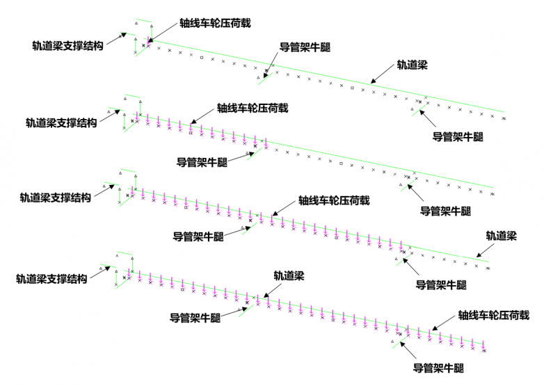轨道梁是海上滚装过程的关键结构,需保证其有足够的结构强度。滚装过程中轨道梁上轴线车数量及位置的不同,会造成轨道梁的受力不同,因此在进行轨道梁强度分析时,需根据轴线车的布置,按照滚装过程中轴线车在轨道梁上的不同位置及车轮数量分多种工况分别核算,找到滚装过程中轨道梁的最不利受力工况,从而进行轨道梁强度核算。轨道梁两端的支撑结构承受轨道梁及升压站组块的全部荷载,需核算两端支撑结构的强度。轨道梁在计算中利用SACS软件将整根梁进行建模,轨道梁两端的支撑结构也与轨道梁一同建模,轨道梁上荷载按照轴线车的轮子进行加载,根据组块重量及轴线车重量推算出轴线车每个轮子的竖向力,然后按照轴线车在轨道梁上轮子数量的不同,分工况分别进行计算。利用SACS进行各工况边界条件及荷载施加情况见图11,轨道梁及两端支撑结构强度计算结果见图12。