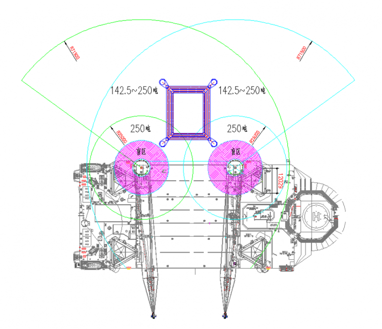 平台可利用甲板区域需保证在升压站组块高度范围内,平台甲板上没有任何结构或设备与升压站组块产生干涉,以保证升压站组块可从平台一侧滚装上平台,从另一侧滚装离开平台。平台的桩腿长度需保证当桩靴最大入泥后,平台仍可沿桩腿升至水面上预定高度,以保证组块可从自升式平台滚装到导管架上。自升式平台的甲板承载力需大于轴线车运输组块在平台甲板上行走期间的最大对地压力,以保证可以用甲板区域的任何位置均满足承载力要求。平台预压能力的要求为,平台的单桩预压能力需大于滑移安装升压站组块期间,各个桩腿上的最大对地压力,保证组块滑移安装期间平台的稳定性。升降装置能力的要求包括两方面,1)升降能力要求,2)锁桩能力要求,升降装置要具备将平台甲板、升压站组块及相关支撑固定结构沿桩腿上下升降,锁桩的能力要求是单个桩腿的锁桩能力需大于组块滑移期间任何桩腿上平台传递到桩腿上的压力。吊机能力的要求包括吊重及吊装半径,吊机在吊装导管架上滚装轨道时,吊装半径满足要求的同时,吊机的吊重也需满足。以某双吊机自升式平台为例吊机吊重及半径能力核算见图8。