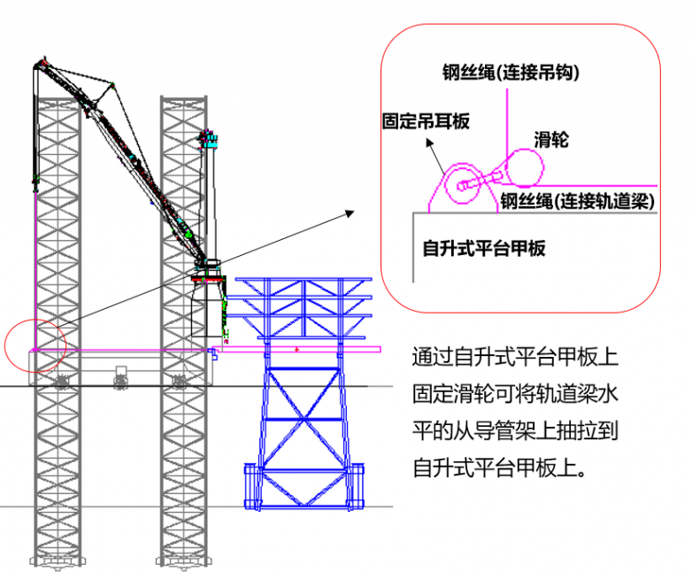 完成组块海上滚装及组块与导管架腿焊接后,需将组块与导管架之间的轨道梁进行回收,轨道梁的回收通过水平牵拉法实现。轨道梁回收前先将自升式平台下降到甲板面与轨道梁底面平齐,然后将轨道梁回收耳板及滑轮安装在自升式平台甲板上,将牵拉钢丝绳的一端穿过滑轮并连接到吊机上,将牵拉钢丝绳的另一端连接到轨道梁上,然后通过吊机回收钢丝绳,轨道梁随着钢丝绳一起牵拉到自升式平台甲板上。轨道梁牵拉过程见图14。