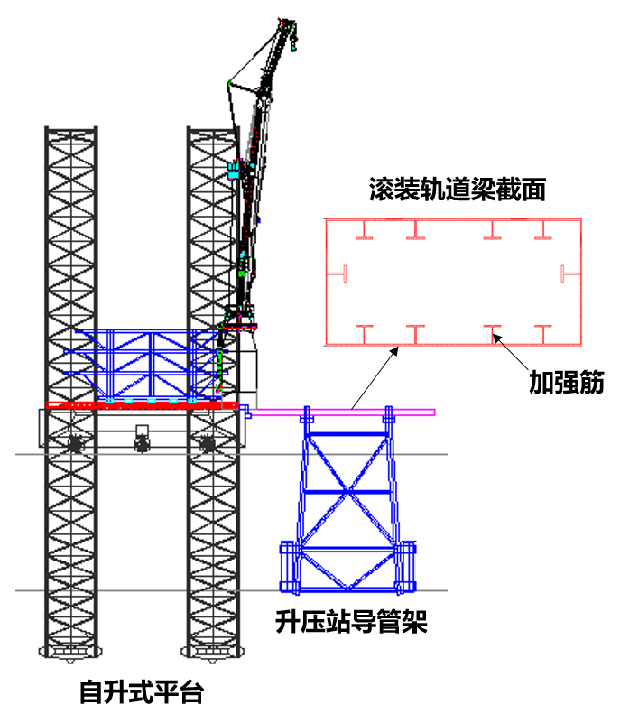利用自升式平台进行升压站组块安装,包括自升式平台的安装,自升式平台甲板承载力,海上滚装过程中自升式平台的稳定性,滚装过程中轨道梁及轨道梁支撑结构的强度分析,组块与导管架对位方案,轨道梁回收方案等几个关键环节。