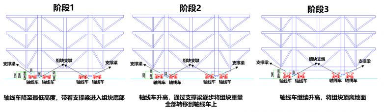 轴线车支撑梁是轴线车运输组块时的工具,布置于轴线车与组块底部之间,用于弥补轴线车升降高度的不足,使轴线车可将组块顶升离开地面及将组块下放至导管架腿顶部,轴线车支撑结构的高度由轴线车的顶升高度及组块底部桩腿的伸出长度来确定,其截面需根据组块重量进行计算分析确定,轴线车支撑梁使用过程见图3。