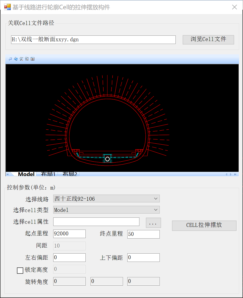(2)基于线路中线的BIM模型构件布设与拼装:实现基于线路的单个构件空间位置计算、构件单点摆放、构件阵列摆放、构件拉伸摆放、基于基准线的构件沿地形摆放。