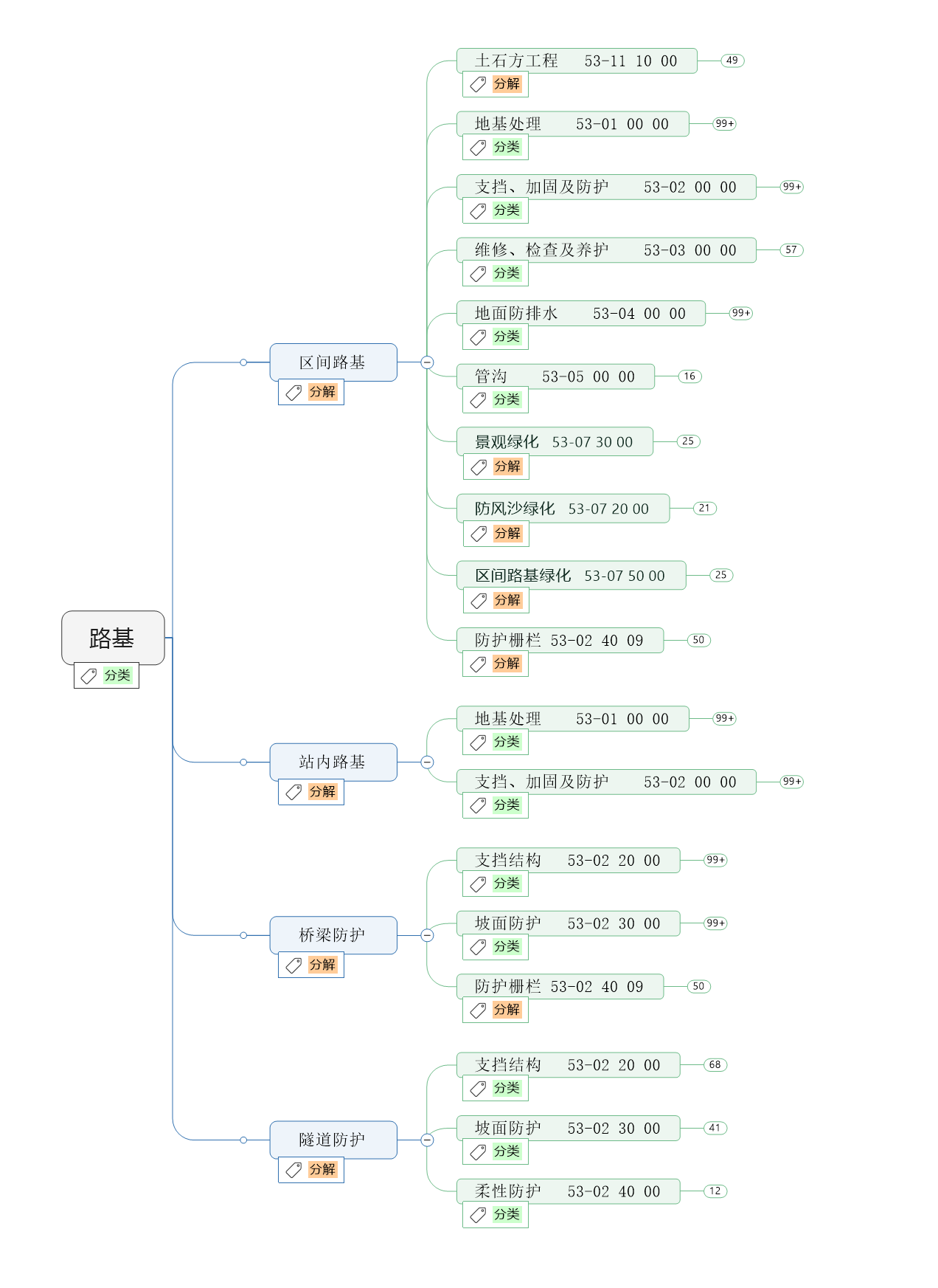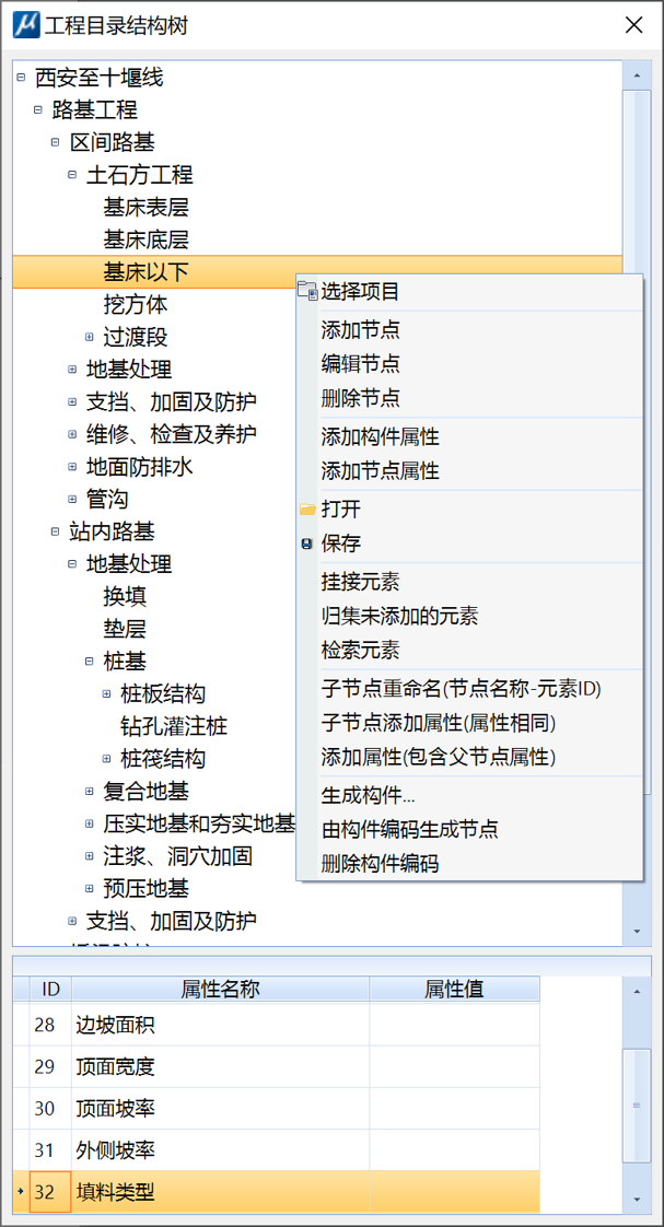 依据铁路BIM联盟发布的《铁路工程信息模型分类和编码标准》《铁路工程信息模型交付精度标准》《铁路工程实体结构分解指南》等标准规范,研究各专业结构树组成与构件划分,从最小设计单元划分、结构树建立、节点属性定义、坐标集建立、结构树管理、专业结构树实例化6个方面制定结构树建立技术原则。在专业结构树的基础上,对节点对象所具有的属性在命名、类型、长度、值空间等方面进行标准化。根据信息模型表达标准,节点属性可包括几何信息和非几何信息[13]。几何信息包括几何表达信息、尺寸信息、定位信息等;非几何信息包括标识信息、角色与时间信息、工程信息、功能性能信息、材料材质、产品信息、养护维修信息、关联文档信息、空间结构关系、功能结构关系等[14]。图8为路基专业建立的专业结构树。