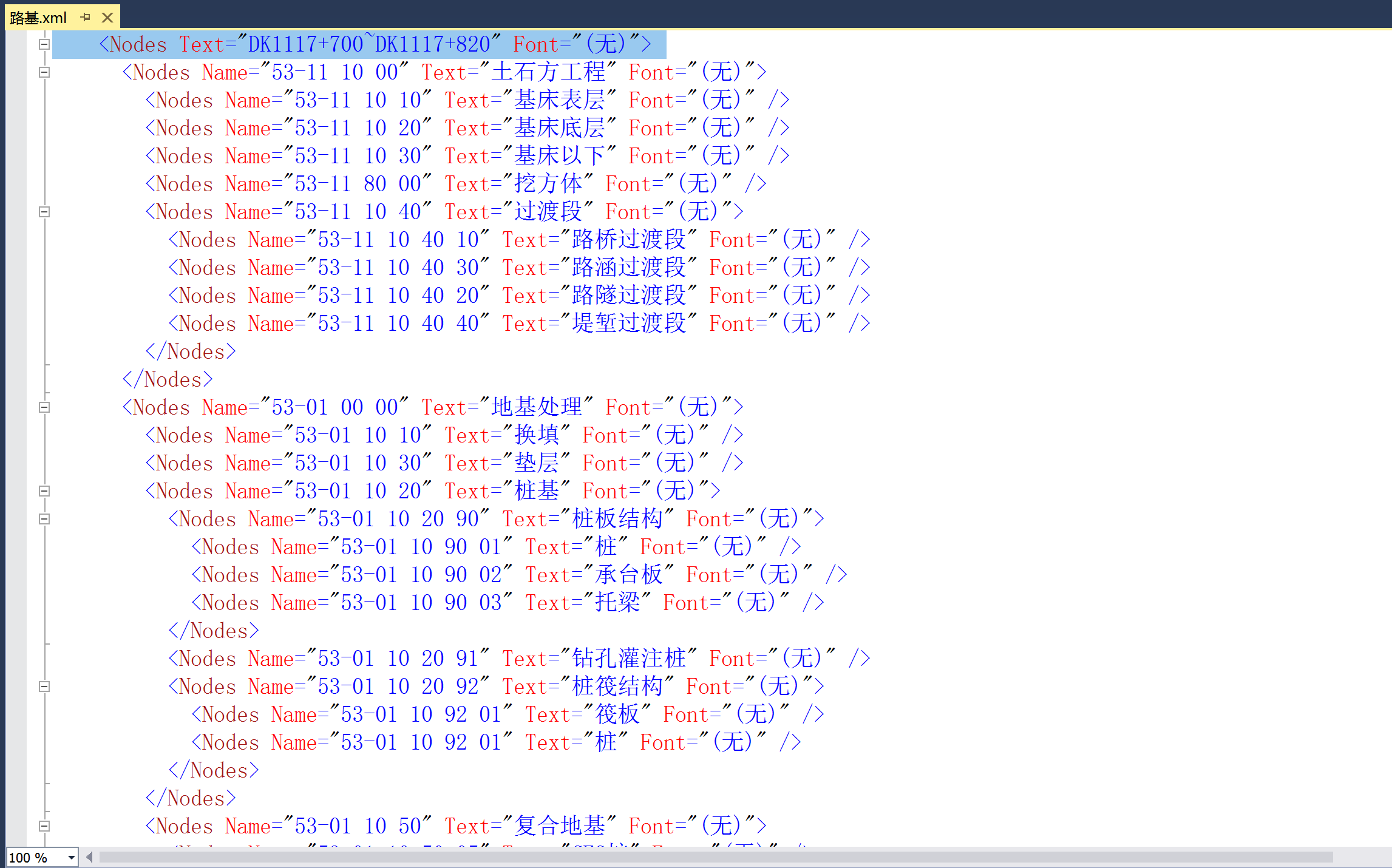专业结构树的结构化包括3个方面。一是专业结构树表达结构化,根据建立原则,以思维导图的方式建立基于最小设计单元的专业结构树。结构树层级展开后由大到小可清晰展现设计工点与单元内的全部构件。二是属性信息的结构化,结构树的节点属性包含几何属性和非几何属性,对其进行特征定义,包括名称、ID、类型、枚举值、缺省值、取值范围、描述、分组、序号等,并对属性在命名、类型、长度、值空间等方面进行标准化[15]。三是实例化结构树,在BIM模型设计过程中建立每个构件单元之间的逻辑结构关系,并实例化构件单元,通过层级结构编码逆向解析生成结构树,与BIM模型构件进行关联,最终将这个工程实例化结构树以通用的数据交换格式XML输出(图9)。经过实例化的结构树描述了整个BIM模型构件逻辑层级关系、构件数量,可以实现构件的快速定位,实现同类构件集中管理。