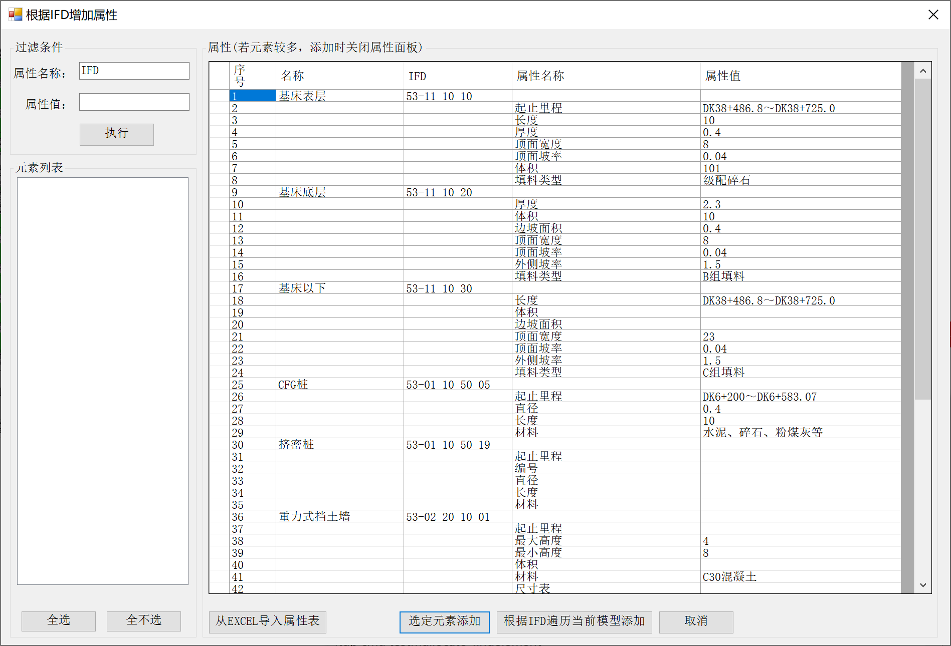 BIM作为信息化模型,是整个工程项目的信息资料库,非几何属性信息是其重要组成部分,它在工程全生命周期各阶段的传递与留存,对BIM持续发展有着至关重要的影响[18]。基于专业结构树,采用ItemType属性添加方式,实现模型属性信息的添加,通过检索或筛选,将BIM模型构件与专业结构树的节点进行关联,然后给专业结构树的节点赋值,实现单一BIM模型构件和多个BIM模型构件属性自动添加(图10),并可通过IFD批量进行属性信息的更新,如图11所示。