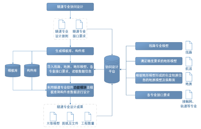 针对项目进行隧道专业原则和隧道专业接口要求的编写,根据设计原则选择复用模板库和构件库或创建新模板库和构件库。通过CDE协同设计平台导入线路模型、地质模型、地形模型、各专业接口要求并读取数据信息。利用隧道专业软件功能模块及模板库和构件库进行设计,最终形成包含三维模型、图纸及文件、工程数量的隧道专业设计成果(见图1)。