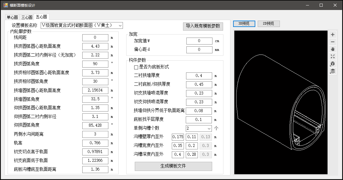 针对隧道中沿线路方向延伸的构件,一般采用建立参数化模板库的方式进行设计。根据隧道专业设计原则,进行隧道断面设计,创建项目在不同围岩等级下的隧道断面参数化模板库[18]。使用研发软件,根据不同线路规格进行隧道横断面模板设计,首先选择隧道断面类型包含单心圆、三心圆、五心圆,通过修改模板参数对隧道断面,内轮廓、初期支护、二次衬砌、仰拱填充、水沟电缆槽等构件进行参数化设计,并储存为模板库文件(见图3)。通过在页面进行2D、3D预览判断断面是否正确,可检索并导入其他项目模板库进行复用或修改,通过在不同项目中使用,不断丰富模板库,达到在标准隧道工程中可直接使用既有模板库的阶段,提高设计效率,实现隧道模板信息化管理。