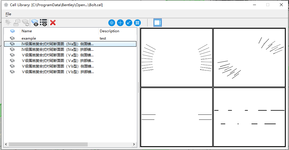 针对隧道内间距布置或独立出现的构件,如锚杆、辅助措施、集水井等,不适合通过模板库进行拉伸设计,因此使用构件库进行参数化设计,将构件以共享单元的形式存储并根据设计需要批量放置在线路上。使用研发软件,导入模板库文件获取隧道断面数据,并在设计界面中输入不同构件参数,生成共享单元,储存在构件库文件中。以锚杆为例(见图4),点击选取衬砌断面获取模板库数据,输入拱顶环向间距、拱顶纵向间距、锚杆长度、锚杆直径等参数,点击生成锚杆单元形成构件库文件,通过OpenRail Designer自带的cell相关功能可对建立完成的构件库进行预览(见图5)。构件库配合模板库使用,在其他可复用模板库的项目中,配套构件库也可进行复用,实现隧道构件信息化管理。