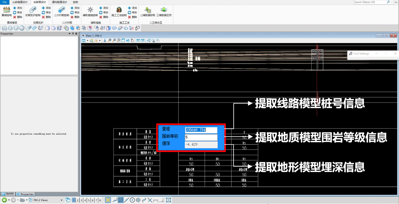 打开隧道工点文件后,通过工点信息功能录入工点名称、起始里程、终止里程,通过CDE协同设计平台参考线路、地形、地质模型并通过专业接口自动读取专业数据辅助设计,包含线路模型中空间位置、桩号、曲线要素等信息;地型模型中地形、地面高程、坡度等信息;地质模型中围岩、地层、地质纵断、工程地质、水文地质等信息。在纵断面视图使用围岩绘制、初期支护绘制、二次衬砌绘制、辅助措施绘制、施工工法绘制等工具进行纵断面表格的绘制。以围岩绘制为例,使用围岩绘制工具后,界面会出现窗口(见图6),随着鼠标在纵断面的移动,表中里程数值会根据读取的线路数据自动变化,围岩等级根据提取的地质数据自动变化,埋深根据提取的地形数据自动变化,通过移动鼠标调整里程或直接输入里程确定纵断面表格起终位置,进而完成整条隧道的纵断面表格设计。在设计过程中,通过实时读取其他专业数据进行协同设计,避免了人为获取数据发生错误的情况,提高了设计精度,符合正向设计思路。