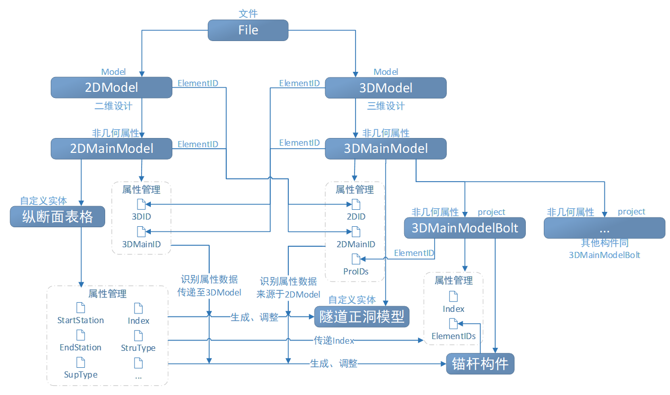 (4)在3DModel中,通过3DMainModel中的2DID识别2DModel,读取2DModel中StartStation、EndStation、SupType、StruType等属性生成隧道正洞自定义实体,并将这些属性存入自定义实体中,另外添加Index属性进行分段管理。生成的每段衬砌里程范围内锚杆构件生成时,在3DMainModel非几何属性下新建一个非几何属性project以3DMainModelBolt命名,在3DMainModelBolt下储存该段的Index和段落内全部锚杆单元的ElementIDs。全部project的ElementIDs储存在3DMainModel的ProIDs中。辅助措施等其他构件创建的方法与锚杆类似,都通过project进行区分,通过ProIDs和ElementIDs进行分类和管理。