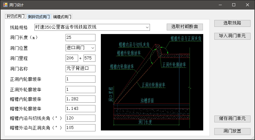 隧道洞门设计方式类似于参数化构件设计,使用研发软件选择洞门形式,输入洞门参数生成洞门单元模型,根据需要放置在线路中。以斜切式洞门为例(见图9),进入斜切式洞门设计页面,选择线路规格并选取正洞衬砌断面后,默认洞门参数为该线路规格洞门通用图参数。根据需要进行参数调整,点击储存洞门单元会以洞门名称参数命名生成单独构件文件。选择线路后,点击洞门放置,则会根据洞门里程、位置等参数将洞门构件放置在线路元素上。在洞门模型上,还需要手动根据所在地层情况补充地基处理、特殊构件等目前尚未形成参数化的结构。