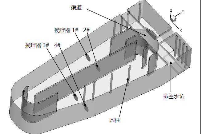 利用本特利系列软件,按照1:1的比例创建生物池的3D模型,下图是水池几何模型的展示(以调节池为例)。进出水口及搅拌器布置如图1所示。