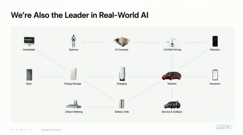 特斯拉不止于车,作为全球知名的电动汽车制造商,它的创新之路从未止步于汽车本身。从电动车到自动驾驶,从太阳能板到储能设备,从芯片到人形机器人,特斯拉以人工智能为核心来整合未来交通出行、储能设备、机器人领域等新兴关键技术,用颠覆性的方式来解决人、物和能源流动的根本性问题,形成全产业链垂直整合的创新综合体。