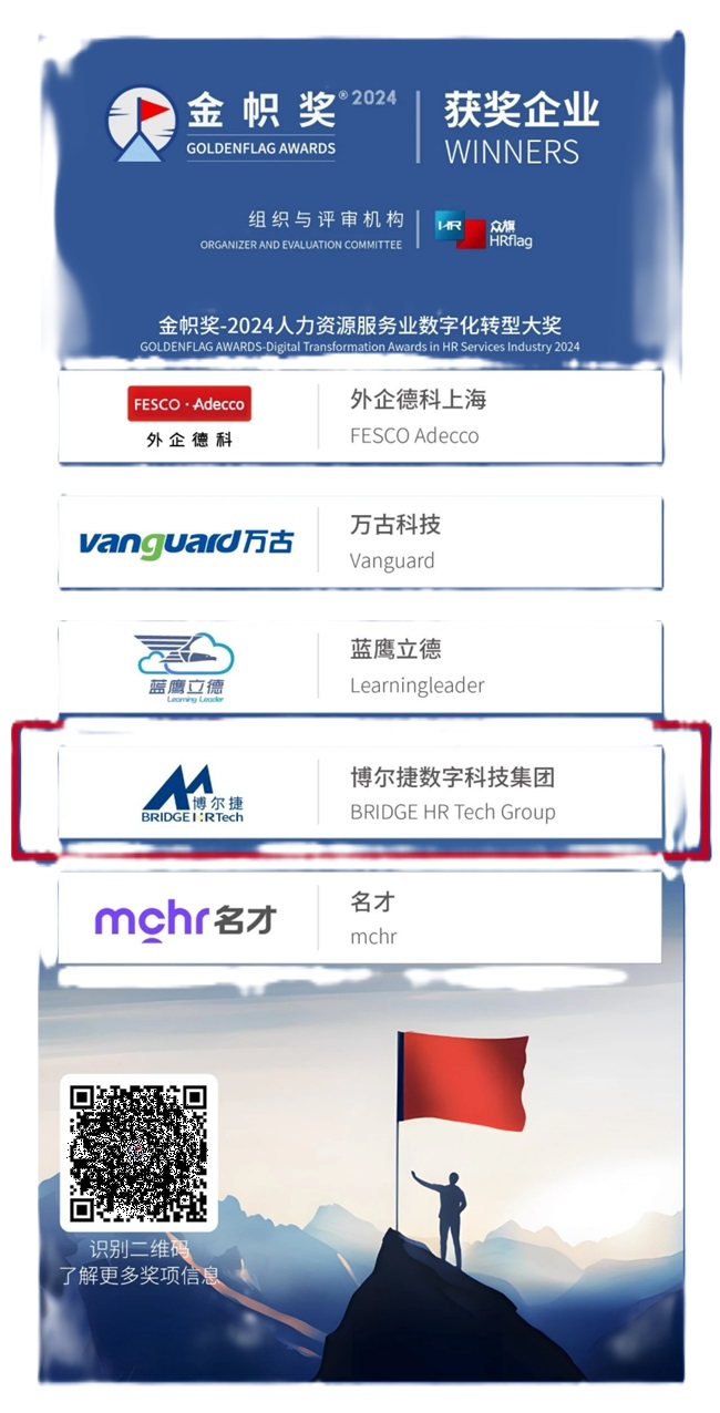 “金帜奖”(GoldenFLAG® AWARDS)自创立以来,便以其权威性、专业性和影响力,成为衡量中国人力资源服务行业发展的重要标尺。该奖项通过严格的评审流程,全面评估参评机构在创新能力、服务质量、品牌影响力等多个维度的表现,旨在挖掘并表彰那些引领行业潮流、推动行业进步的杰出企业。博尔捷数字科技集团能够从众多优秀机构中脱颖而出,充分证明了其在人力资源服务业数字化转型领域的卓越实力。随着信息技术的飞速发展,数字化转型已成为人力资源服务行业不可逆转的趋势。未来,博尔捷数字科技集团将继续秉承“创新、协作、共赢”的发展理念,不断深化数字化转型战略,推动人力资源服务行业的创新发展,为构建更加高效、智能、可持续的人力资源生态体系贡献力量。