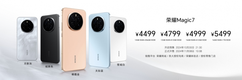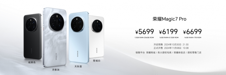 荣耀Magic7和荣耀Magic7 Pro将于2024年10月30日21:30开启预售,11月8日10:08在荣耀商城、各大授权电商、荣耀体验店、授权零售门店正式开售。其中荣耀Magic7提供12GB+256GB、12GB +512GB、16GB +512GB、16GB+1TB四个容量版本,售价4499元起;荣耀Magic7 Pro提供12GB+256GB、16GB +512GB、16GB+1TB三个容量版本,售价5699起。