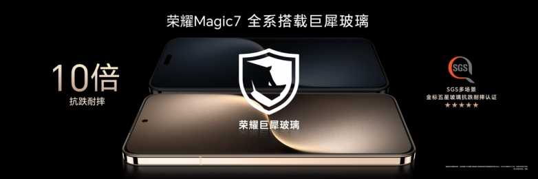 荣耀Magic7系列还为不同喜好的消费者提供了两种屏幕设计,荣耀Magic7标准版采用超窄等边直屏,可以带来更好的操作顺滑感;荣耀Magic7 Pro采用等深微四曲屏,带来更沉浸的观看体验和出色的握持感。全系搭载荣耀巨犀玻璃,让荣耀Magic7系列具备了10倍的抗跌耐摔能力。