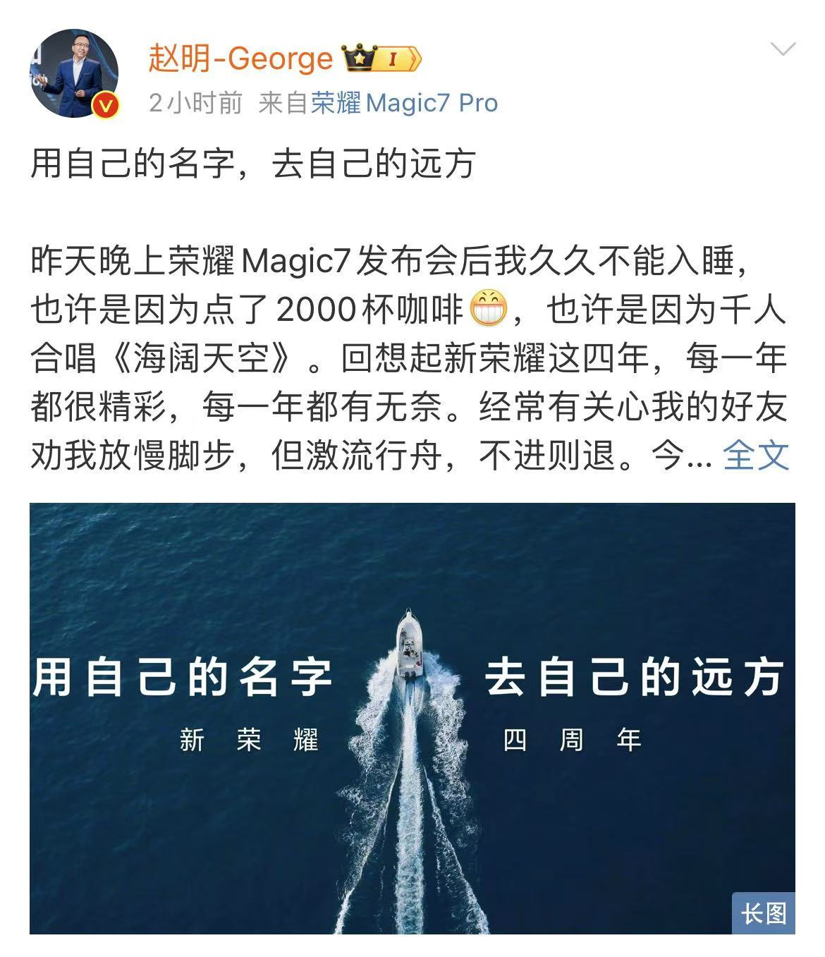 四年前,行业没人相信AI能重构操作系统,荣耀毅然投入平台级AI的建设;没人相信折叠屏能成为主力机,荣耀每年投入超过10%的收入做研发,让折叠屏突破毫米时代,成为越来越多人的主力机;没人相信荣耀能重返国际舞台,但2024年的荣耀,接连收获“亚洲最佳智能手机”和“全球最佳产品大奖”。就如荣耀CEO赵明所说:“四岁的新荣耀,已在全球终端市场撑起一方天地,我们正用自己的名字,去自己的远方。”