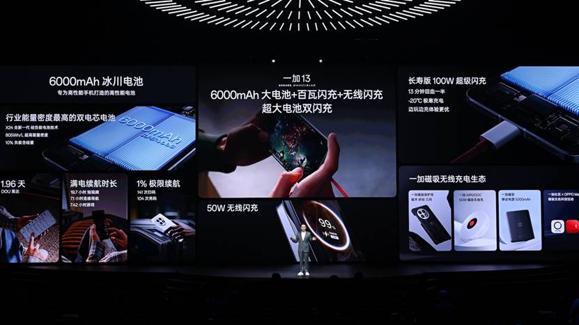 2024 年,一加以「冰川电池」开启了手机的长续航时代。一加 13 续航体验再进化,带来 6000mAh 超大容量「冰川电池」,DOU 续航达到 1.96 天,即使 1% 应急电量也可支持最长 13 小时超长待机。一加 13 冰川电池基于新一代球型硅碳以及蜂巢仿生结构打造,能量密度达到行业领先的 805Wh/L,这让一加 13 在拥有大电池容量的同时还能保证轻薄手感,同时得益于行业领先的电池工艺技术以及硅碳负极电池健康算法,一加 13 还实现了电池的久用耐用,使用寿命更长。