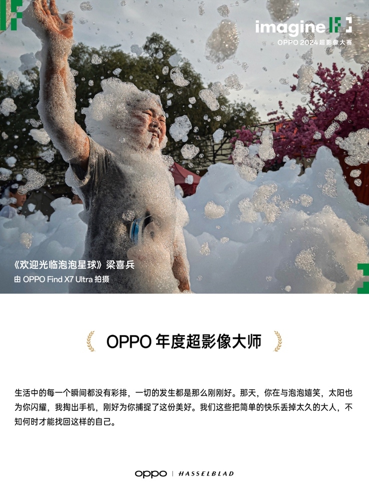 由摄影师梁喜兵拍摄的《欢迎光临泡泡星球》最终获得2024 OPPO年度超影像大师奖项。该幅作品中,少年展示出孩子在泡泡中嬉戏的童趣故事。在OPPO Find X7 Ultra镜头下,呈现了最本真的童年幸福感。