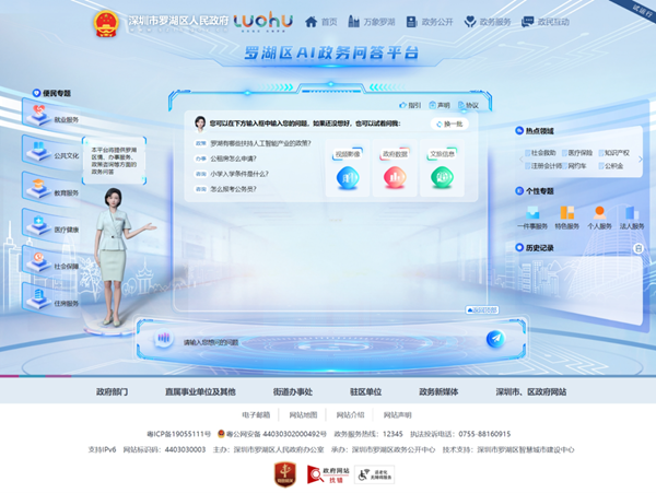 “您好!欢迎来到罗湖区AI政务问答平台。”近日,深圳市罗湖区政府门户网站首页新增了一个数字人图标,上面写着“AI政务问答”字样。一个极具未来感、以蓝白为主色调的页面。