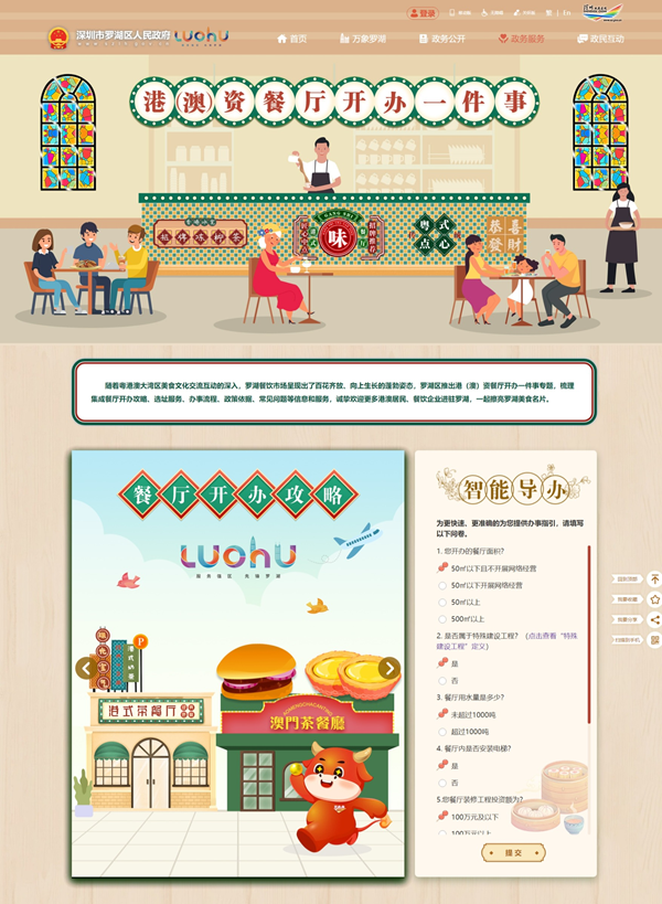 进入“港(澳)资餐饮企业开办一件事”服务专题,五颜六色的配色和马赛克图案令人仿佛置身一家港式茶餐厅。该专题还贴心地使用了繁体字,结合罗湖城区形象IP“罗犇犇”拟人化设计,整合罗湖美食地图、企业开办选址服务热力图、开店手续办事指引等形成餐厅开办攻略,同时根据餐厅开办面积、装修工程投资额、用水量等情况设置智能引导小问卷,让用户在高效、直观、愉悦的体验中选择最符合自身需求的服务。