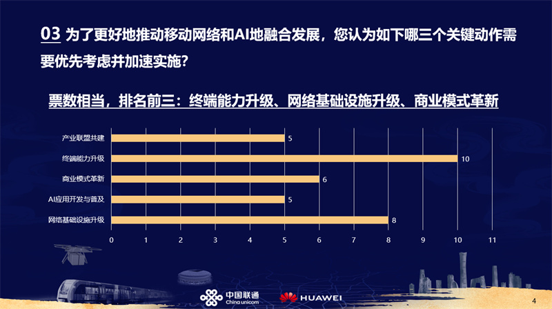 现场调查问卷结果表示,终端能力升级、网络基础设施升级、商业模式革新是排名前三的关键举措。这表示在面对未来新态势时,多维度协同布局战略已成为了行业共识,唯有全方位协同发力,才能够在复杂多变的市场环境中赢得先机,为 5G-A 与 AI 融合产业的长远发展奠定坚实基础。