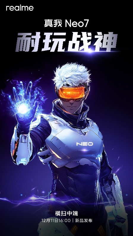 2024年11月28日—中国 · 深圳—真我手机正式官宣,全新真我Neo系列首作——真我Neo7将于12月11日16时正式发布,将带来同档领先的越级性能和游戏体验,并通过极具有辨识度的科技潮流设计,从内到外打造“耐玩战神”,全面横扫中端战场。