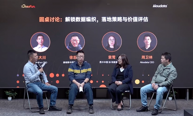 Aloudata 创始人&CEO 周卫林、Aloudata 技术副总裁余俊、康明斯中国区首席架构师徐志蔚、西卡中国 BI 和数据负责人袁莺一同亮相出席。