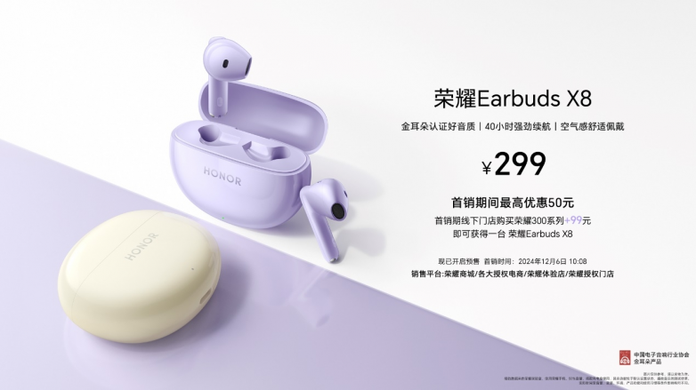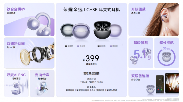 新款耳机荣耀Earbuds X8也在本次发布会上首次和大家见面,拥有金耳朵认证好音质,40小时强劲续航,空气感舒适佩戴。 另有荣耀亲选LCHSE耳夹式耳机全新发布,钛合金拱桥设计,开放佩戴通透轻盈,以及荣耀亲选耳机TiinLab S7、荣耀亲选小湃室外摄像头i等新品现已开售。