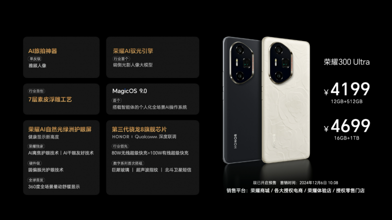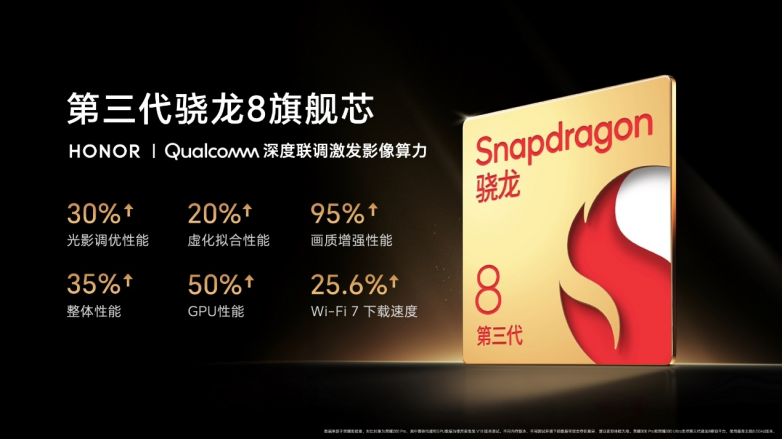 在不断追求技术创新与体验优化的道路上,荣耀再次展现了深厚的技术积累与市场洞察力。在芯片选择上,荣耀300 Pro/Ultra采用第三代骁龙8旗舰处理器。借助深厚的调校功底,高通和荣耀基于影像能力升级共创,赋能雅顾人像,影像性能表现上有显著提升。