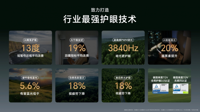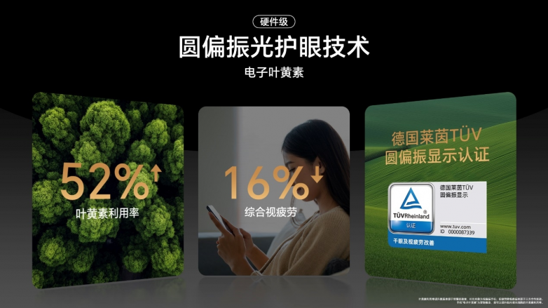 圆偏振光护眼技术有着“电子叶黄素”之称,它模仿自然光线的均匀分布,将传统屏幕的线偏振光转化为更接近自然光的圆偏振光,提高眼部叶黄素利用率,减轻视觉疲劳,给予用户如同自然光照般的舒适体验。而AI离焦护眼技术则结合了先进的离焦技术和图形算法,有效缓解视疲劳。