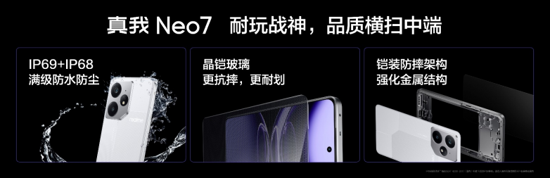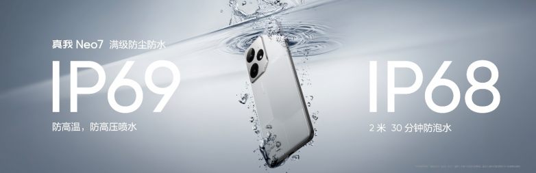 真我Neo7不计成本提升品质,实现IP69+IP68满级防尘防水。至高可实现2米+30分钟的防泡水,以及防高温、防高压水喷射。在意外浸泡、意外淋溅等极限场景全面降低品质风险,长久使用无惧水气入侵造成零部件损害。