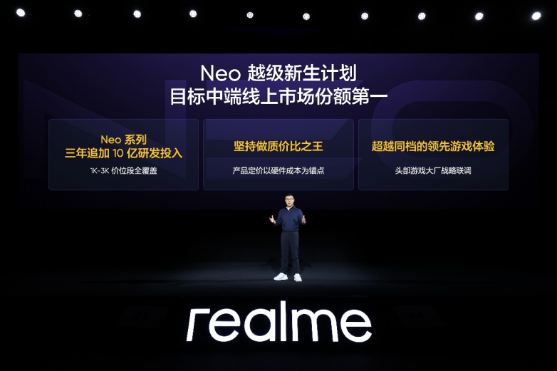发布会上,真我realme副总裁、中国区总裁徐起公布真我产品线以及对Neo系列未来的规划。真我将聚焦GT和Neo两大王牌系列,其中,GT系列定位高端性能旗舰,顶级的性能配置、极致的游戏体验,代表真我最高的科技水平,Neo系列则定位中端电竞旗舰,将继续坚守越级性能、领先游戏体验和科技潮流设计三大标签,打造更懂年轻人的电竞旗舰。