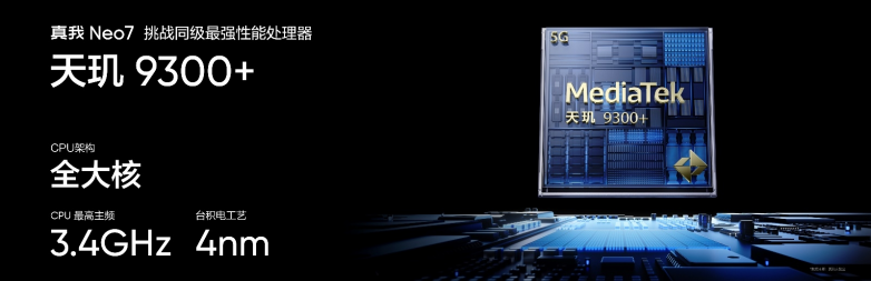 真我Neo7搭载价位段最强处理器——天玑9300+。得益于天玑9300+的全大核CPU架构、3.4GHz最高主频以及4nm工艺三大优势,使得真我Neo7在重负载游戏下能获得更极致、更高能效比的电竞体验。在极致性能基础上,真我Neo7更是全面优化性能调度、散热系统以及信号表现,打造久玩不掉帧、久玩不烫手、弱网不掉线的游戏神机。