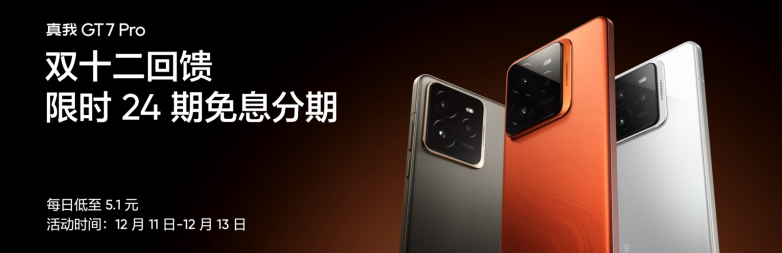 真我GT7 Pro正式开启双十二活动。12月11日-13日,真我GT7 Pro开启限时24期免息分期。此外,还有 “火星移民计划”:即日至12月13日,购买真我GT7 Pro,骁龙 8 至尊版机型以旧换新可享受至高1200元额外补贴。