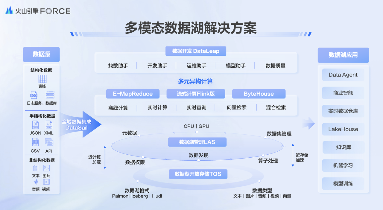 从数据源来看,火山引擎多模态数据湖解决方案涵盖传统的结构化数据,如企业日常运营产生的表格、日志服务以及各类数据库;也包含半结构化数据,如在互联网交互中常见的 JSON、XML、CSV 格式数据以及通过 API 接口获取的数据;更有非结构化数据,如海量的文本资料、丰富多样的图片、各种音频片段以及视频文件等。这些数据源通过全域数据集成 DataSail 进行无缝整合,打破数据孤岛,提升利用效率。