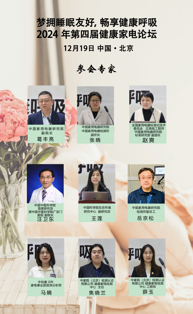 中国家用电器研究院副院长葛丰亮,中国家用电器研究院检测所副所长张晓,全国家用电器标准化技术委员会正高级工程师赵爽,中国中医科学院首席研究员/原中国中医科学院广安门医院副院长汪卫东,中国科学院生态环境研究中心副研究员王莲,中国家用电器研究院检测所副总工岳京松,中怡康GfK家电事业部资深分析师马嫡,中家院(北京)检测认证有限公司健康家电检测中心主任焦晓兰/工程师薛玉,以及美的、海尔、小米、松下、万家乐、石头、莱克、霍尼韦尔、舒乐士、创维、西门子、澳柯玛、智米、LG、奥佳华、安利、海信、范颂尼、戴森、吉德、康佳、美诺、方太、东陶、箭牌、TCL、三星、九牧、新乐、荣泰、史密斯、格力、长虹、新乐、格兰仕、韩电、瑞尔特等企业代表,健康家电网霍雨佳和30家媒体代表参加本次会议。