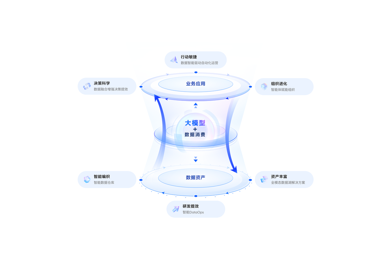 延续去年4月火山引擎发布的数据飞轮“以数据消费促资产建设,以数据消费助业务发展”的内核,升级后的数据飞轮2.0模式更聚焦把AI作为数智化核心竞争力,数据生产、管理、应用等环节全方位融合AI能力,让企业更便捷、更低门槛地消费数据,建设资产,实现价值。